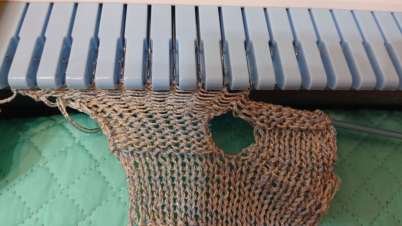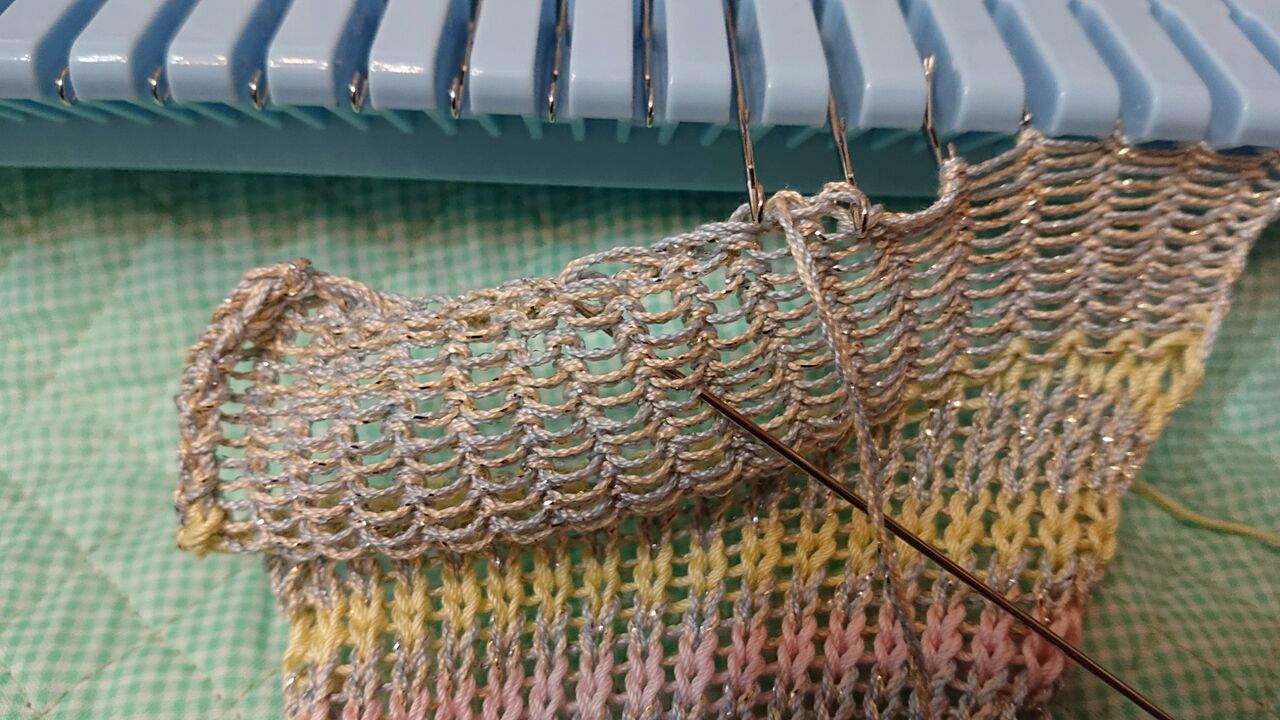 ※裏メリアス編みは編機から糸を外し、棒針に移動し、裏返してはめる。