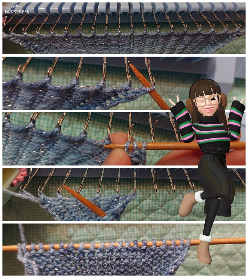 左下順調に編んでいます。必ずカチっという音を聞いて編む。
