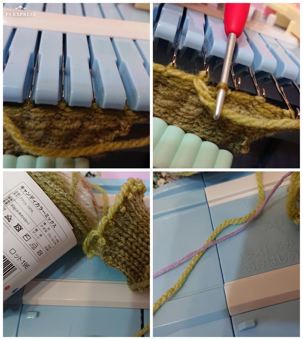 ↑右下の画像 紫がアミーナに同梱の糸で、これ以上太いとうまく編めません。
