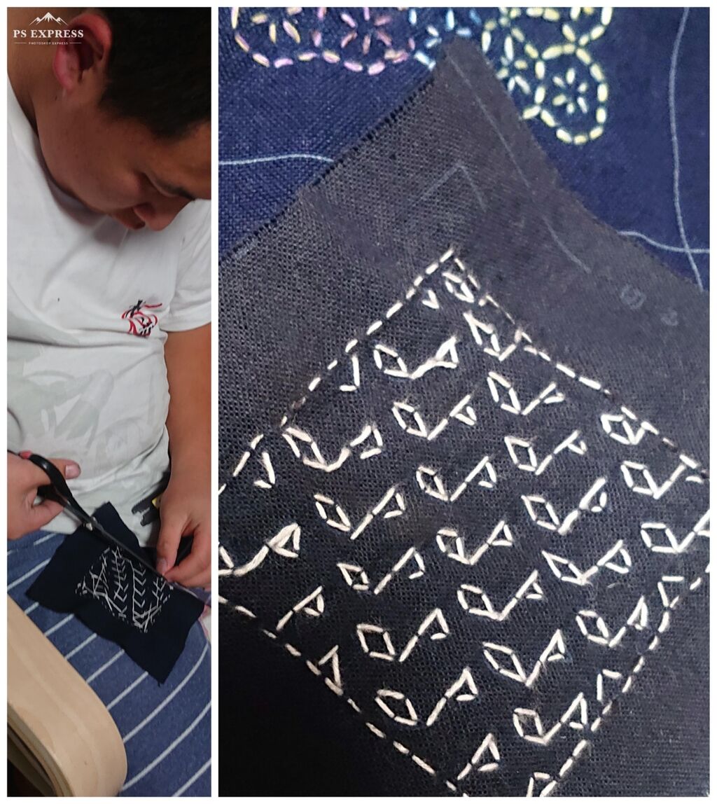 刺し子用の布にすでに図案が印刷されていますので、刺し方説明に沿って、縦→横→斜めの順に刺します。下絵は、水かぬるま湯の中で、軽く押し洗いすることで消えます。