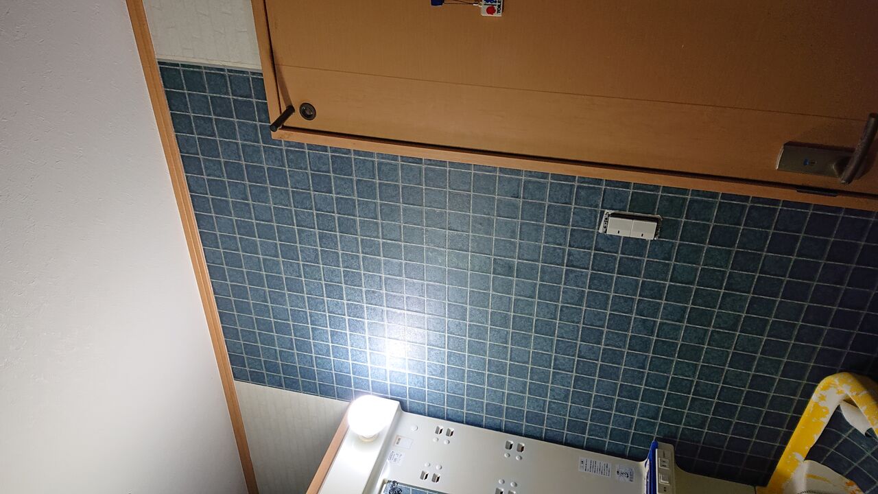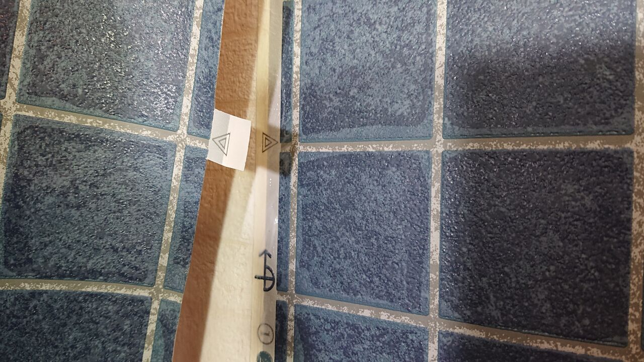 で、貼る。洗面台の右奥の隙間にもきれいに入っていきました。