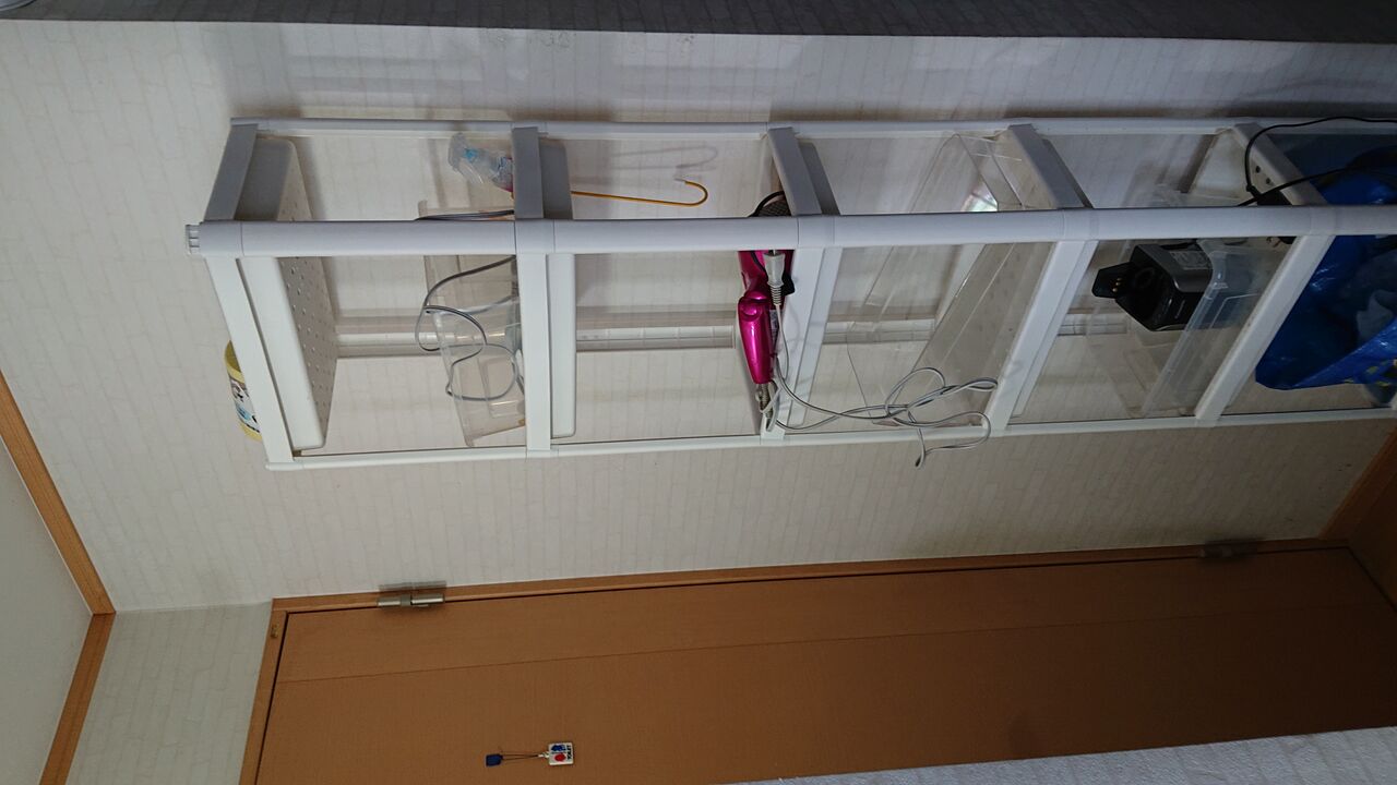 後ろ側はイケアのプラ棚があり、ドライヤー シェーバー バリカンなどが1段ごとに置かれています。